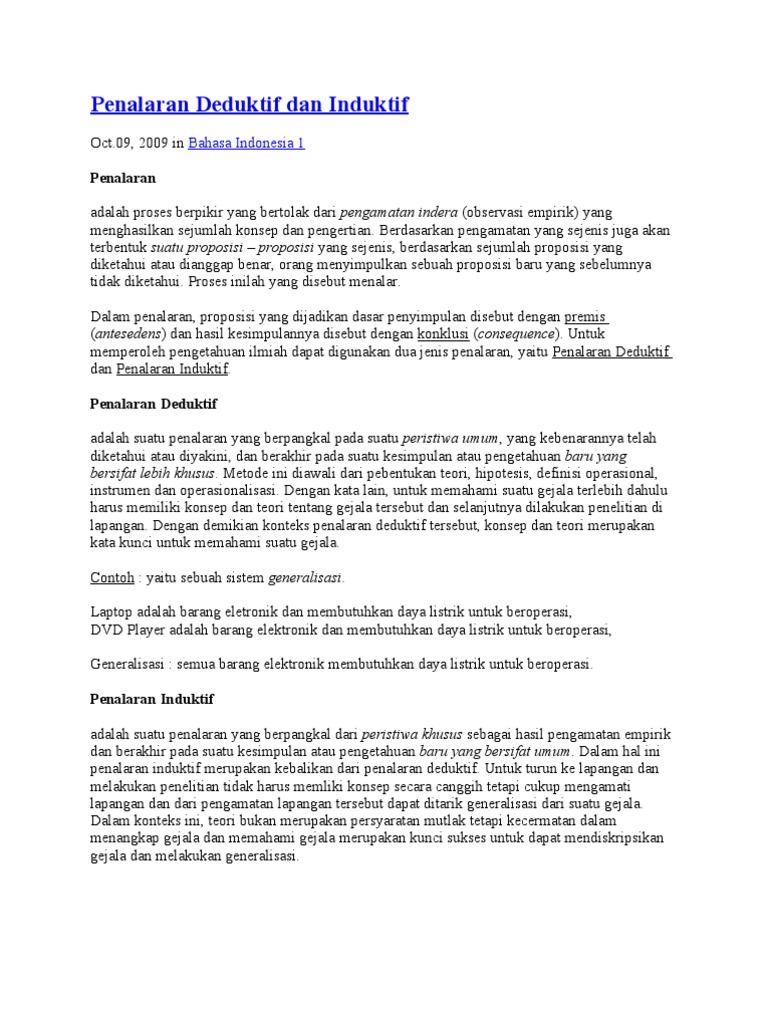 Penalaran induktif merupakan prosedur yang berpangkal dari peristiwa khusus sebagai hasil pengamatan empirik dan berakhir pada suatu kesimpulan atau pengetahuan baru yang bersifat umum. Penalaran induktif penalaran induktif merupakan pr#sedur yang berpangkal dari peristi%a khusus sebagai hasil pengamatan empirik aspek dari penalaran induktif adalah anal#gi dan generalisasi. Contoh penalaran induktif dan deduktif Penalaran induktif (prosesnya disebut induksi) merupakan proses penalaran untuk menarik ada 2 keuntungan dengan penalaran induktif, yaitu: Penalaran adalah proses berpikir yang bertolak dari pengamatan indera (pengamatan empirik) yang menghasilkan sejumlah konsep dan pengertian. Penalaran ilmiah pada hakikatnya merupakan gabungan dari penalaran deduktif dan induktif. Harimau berdaun telinga berkembang biak dengan melahirkan. Pernyataan yang bersifat umum ini bersifat ekonomis. Penalaran induktif adalah / penalaran induktif dan deduktif induksi matematika youtube : Dimana lebih lanjut penalaran deduktif terkait dengan rasionalisme dan penalaran induktif dengan empirisme. Penalaran induktif dan deduktif i. Proses berpikir tentang sesuatu, secara rasional, sehingga menarik kesimpulan yang valid, dikenal sebagai penalaran. Latar belakang masalah pencarian pengetahuan yang benar harus berlangsung menurut prosedur atau kaedah hukum, yaitu berdasar…